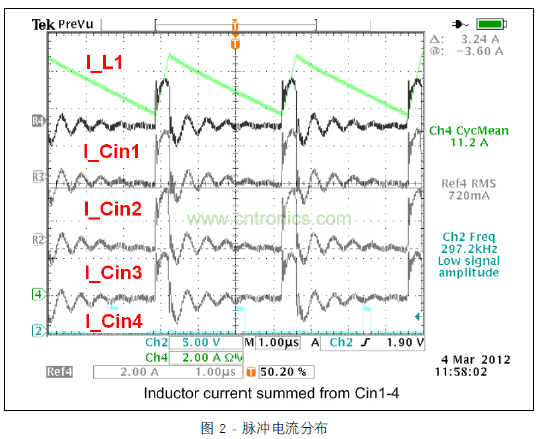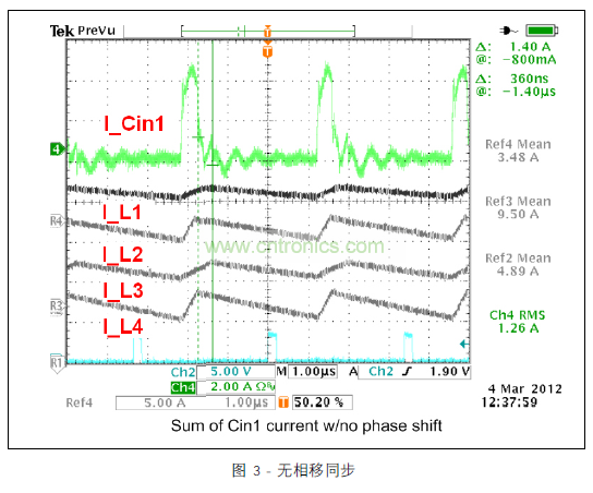 圖 3 顯示的范圍圖片涵蓋所有四個(gè)開(kāi)關(guān)階段中的電感器電流與去耦合通道 1 的輸入電容器的脈沖電流。