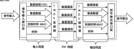 DVI是基于TMDS(TransitionMinimizedDifferentialSignaling,轉換最小差分信號)技術來傳輸數(shù)字信號,TMDS運用先進的編碼算法把8bit數(shù)據(jù)(R、G、B中的每路基色信號)通過最小轉換編碼為10bit數(shù)據(jù)(包含行場同步信息、時鐘信息、數(shù)據(jù)DE、糾錯等),經(jīng)過DC平衡后,采用差分信號傳輸數(shù)據(jù),它和LVDS、TTL相比有較好的電磁兼容性能,可以用低成本的專用電纜實現(xiàn)長距離、高質(zhì)量的數(shù)字信號傳輸。TMDS技術的連接傳輸結構如圖1所示。