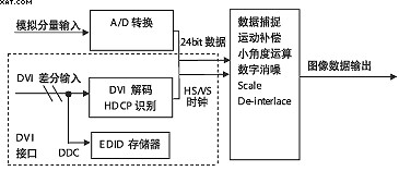 由原理圖看,數(shù)字電視增加DVI接口比較簡單,從硬件電路考慮,一是在接口處增加DVI解碼部分,二是在后端提供一個數(shù)據(jù)通道,如果電視原有方案中具有A/D轉換和相應的后級數(shù)據(jù)處理通道,那么DVI接口解碼輸出的數(shù)據(jù)可以與它共用,因為在數(shù)字信號格式一定的情況下,其碼率、行頻、場頻、時鐘是一致的。