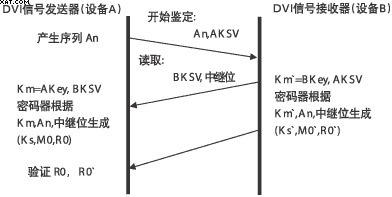 HDCP具體工作過程:首先由主機發(fā)送密鑰選擇導引序列(AKSV)和64bit偽隨機序列(An)到接收方,接收方回傳密鑰選擇導引序列(BKSV)和轉發(fā)器位(REPEAT-bit)(如是轉發(fā)器用以表示身份),發(fā)送方確認BKSV是否已被廢除和是否包含20個1和20個0;如果雙方的設備密鑰和KSV有效,則計算產(chǎn)生一個56bit的公共密鑰Km和Km`,然后可產(chǎn)生KS、KS`(傳輸密鑰)、M0、MO`(64bit后續(xù)驗證用追加初始序列)、RO、R0`(16bit指示驗證成功,它必須在AKSV發(fā)送后100ms內(nèi)傳回發(fā)送方;驗證成功后R01和R0相等;每128幀修正一次,每2s回傳一次)。因此當DVI接口中斷傳輸2s以上,或是非授權設備接收時,主機將停止傳輸內(nèi)容,以達到保護傳輸內(nèi)容的目的。HDCP鑒定處理過程如圖6所示。
