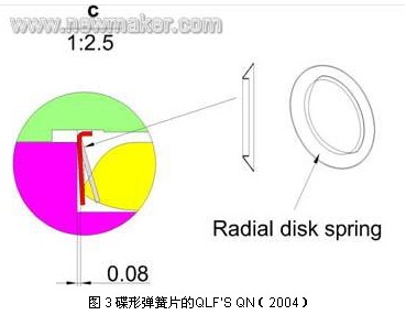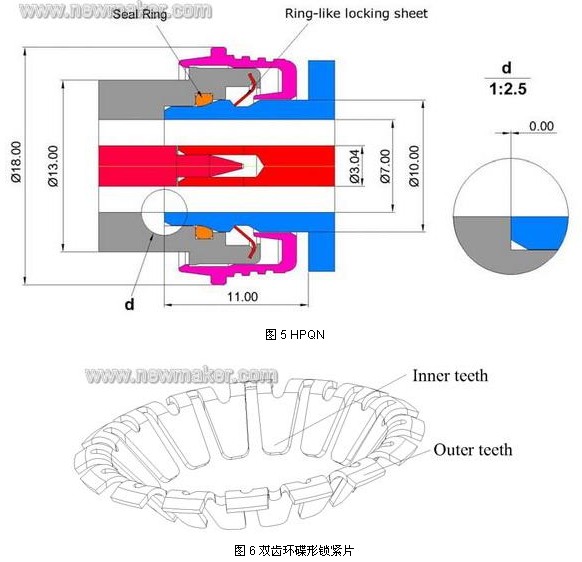 繼 SnapN 之后,07 年Anoison 推出了HPQN 設(shè)計(jì),該設(shè)計(jì)在公頭內(nèi)嵌入一雙齒環(huán)碟形鎖緊片(如圖6),當(dāng)公頭和母頭配合后, 固定在公頭上的雙齒環(huán)碟形鎖緊片緊扣在母頭斜面上,其內(nèi)齒的端面對(duì)母頭產(chǎn)生推力作用,使外導(dǎo)體的端面之間緊密接觸,間隙為0。并且雙齒環(huán)碟形鎖緊片相鄰的內(nèi)齒長(zhǎng)度有差異,使鎖緊時(shí)內(nèi)齒停留在母頭斜面的不同圓周上。這種設(shè)計(jì)利用雙齒環(huán)碟形鎖緊片內(nèi)齒的彈力和母頭斜面的支撐力,巧妙地實(shí)現(xiàn)了公頭和母頭端面之間的保持力和接觸壓力,并能達(dá)到非常好的抗震效果。該設(shè)計(jì)的力學(xué)原理很簡(jiǎn)單,但是鎖緊片與母頭相對(duì)最佳位置的數(shù)據(jù)需要經(jīng)歷大量的試驗(yàn)。