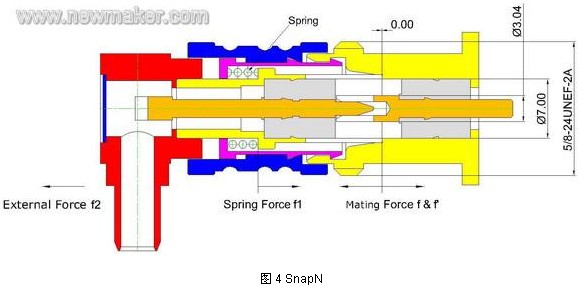 但跟傳統(tǒng)的螺紋連接的N 相比,SnapN 還是有局限性。我們知道 SnapN 外導(dǎo)體端面之間的接觸壓力由其彈簧A 提供--ROSERBERGER 提供的數(shù)據(jù)是30N,根據(jù)力的相互作用原理,我們可以知道接頭的結(jié)合力也是30N。在某些應(yīng)用場(chǎng)合,由于粗重電纜的擺動(dòng),傳導(dǎo)到接頭的作用力很容易超30N,一旦超過這個(gè)臨界力,外導(dǎo)體端面之間會(huì)發(fā)生瞬時(shí)分離,而影響信號(hào)傳輸。那是否能提高這個(gè)臨界力呢?我們知道,彈簧A 對(duì)外導(dǎo)體端面提供的接觸壓力與接頭的結(jié)合力是等量的,如果我們?cè)黾訌椈勺饔昧?--比如增加到100N,那意味著接頭結(jié)合力也達(dá)到100N,顯然,匹配一對(duì)接頭需要用100N 的力氣是讓人無法接受的。