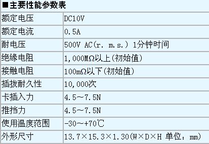 “CIM-J38N”連接器采用了小型、薄型設(shè)計(jì),標(biāo)準(zhǔn)安裝型的物理尺寸為高1.30mm、寬13.7mm、進(jìn)深15.3mm。連接器采用Push-in Push-out推擋方式,卡排出尺寸為3.8mm。同時(shí)還附帶防卡彈出止動(dòng)結(jié)構(gòu)、裝載卡檢測(cè)開關(guān)(Normally open型)、RFID接頭,并增強(qiáng)了卡反向插入功能。另外還增強(qiáng)了EMI對(duì)策用接地線(Ground)功能。
