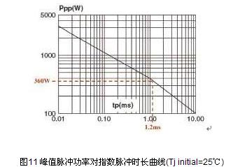我們要解決的問題是根據(jù)所要消除的電涌來確定保護(hù)元器件的參數(shù)。以圖8中的ISO7637-2 脈沖2為例,不難看出,抑制器上的鉗制電壓大約是30V,峰值脈沖電流 (Ip)大約是12A,在Ip/2點(diǎn)測得電流脈沖時長(tp)是4μs。因此,可判定TVS必須消耗360W的最大脈沖功率(Pp) 。所有這些Pp、Ip和tp值是有用的,因為它們可以幫助比較TVS數(shù)據(jù)表中的峰值脈沖功率對指數(shù)脈沖時長的曲線,以確保TVS在應(yīng)用的限制范圍內(nèi)。