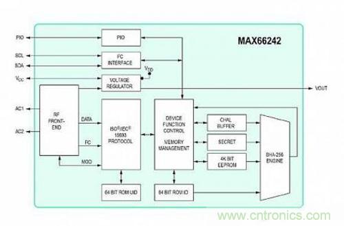 幾種功能對于無線NFC/RFID應(yīng)用非常重要:集成到無源標簽認證器的高級安全性(圖2)、集成無線NFC/RFID接口和I?C接口、數(shù)據(jù)保護模式、高速數(shù)據(jù)傳輸、標簽?zāi)芰渴占籑AX66242集成了SHA-256加密引擎,提供基于安全密鑰的對稱式質(zhì)詢-應(yīng)答安全認證。是控制NFC/RFID讀卡器與那些設(shè)備通信,以及如何與MAX66242通信的最好途徑。32字節(jié)SRAM緩存器有利于通過I?C接口進行高速數(shù)據(jù)傳輸。標簽上的能量收集引腳VOUT使其利用天線從讀卡器的HF場收集能量。