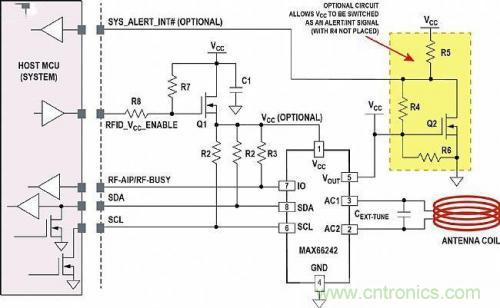 圖4. 嵌入式設(shè)計中支持NFC/RFID功能的典型電路圖。該電路與MAX66242安全認證器標簽的主要功能相結(jié)合,使嵌入式系統(tǒng)能夠支持當(dāng)今便攜式以及安全、嵌入式系統(tǒng)的新型非接觸應(yīng)用。