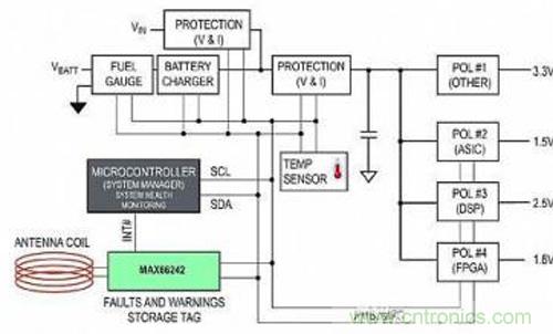 設(shè)計者可利用MAX66242儲存對系統(tǒng)運行至關(guān)重要的診斷和故障數(shù)據(jù)。在系統(tǒng)“死機”后或未上電時,可上傳該數(shù)據(jù)。這種系統(tǒng)健康和故障數(shù)據(jù)的收集是通過NFC/RFID標簽的接口實現(xiàn)的。圖7所示為典型的電源管理系統(tǒng),其中每個負載點(POL)穩(wěn)壓器由公共電源管理總線(PMBus)進行配置和監(jiān)測。PMBus僅僅是I?C總線的一種變體。系統(tǒng)正常工作期間,持續(xù)監(jiān)測每個POL的關(guān)鍵工作參數(shù)。在持續(xù)監(jiān)測模式下,系統(tǒng)管理器也可執(zhí)行修正措施,以響應(yīng)故障或工作報警。