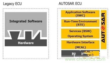 就本質(zhì)而言,AUTOSAR提供標(biāo)準(zhǔn)的ECU接口定義,使設(shè)計(jì)人員能夠具體指定每個(gè)汽車ECU中都需要的可重復(fù)使用之標(biāo)準(zhǔn)化軟件層和組件。該標(biāo)準(zhǔn)不受硬件的影響,這意味著應(yīng)用軟件和硬件平臺(tái)是相互獨(dú)立的。應(yīng)用軟件開(kāi)發(fā)人員可在應(yīng)用軟件中明確地說(shuō)明各個(gè)汽車功能的細(xì)節(jié),而不用擔(dān)心相關(guān)軟件服務(wù)和硬件接口。過(guò)去,軟件和硬件緊密地整合在一起,因此很難實(shí)現(xiàn)可移植性和可重復(fù)使用(圖1)。