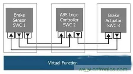 將設(shè)計(jì)與硬件決策分開(kāi)使車輛生產(chǎn)商/OEM能夠依據(jù)所需的車輛功能進(jìn)行自上而下的設(shè)計(jì)。存在于這個(gè)設(shè)計(jì)時(shí)間的虛擬功能總線(VFB)概念讓所有軟件電子控制單元都能夠?qū)崿F(xiàn)互連和獲得測(cè)試。這讓設(shè)計(jì)人員可專注于應(yīng)用層,而不是根本的軟件基礎(chǔ)建設(shè)。通過(guò)采用虛擬功能總線,應(yīng)用軟件組件(SWC)與其它應(yīng)用軟件組件也相互獨(dú)立。軟件組件向虛擬功能總線發(fā)出輸出信號(hào),虛擬功能總線再將信息傳送給目標(biāo)組件的輸入埠。AUTOSAR定義了輸入和輸出端口,以及交換信息的格式。這種抽離式的(abstracted)方法使得在定義相關(guān)硬件之前可實(shí)現(xiàn)所有車輛軟件功能和接口交互驗(yàn)證。設(shè)計(jì)調(diào)整也因此變得容易得多,同時(shí)所有功能都被定義成虛擬功能總線上的軟件組件(圖2)。