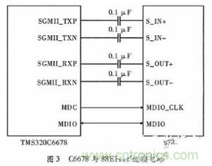 C6678和PHY芯片88E1111的接口電路如圖3所示。88E1111工作在SGMII接口模式下,不需要TXCLK時鐘輸入,更有助于減少電路板上走線的數(shù)量,同時也可減少噪聲的產(chǎn)生。