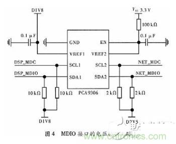因?yàn)?8E1111上集成的MDIO與C6678集成MDIO模塊進(jìn)行連接時,電壓有所差別,前者電壓為2.5 V,后者電壓為1.8 V,所以在二者之間應(yīng)該添加電壓轉(zhuǎn)換器。本文采用一片PCA9306,實(shí)現(xiàn)2.5 V和1.8 V之間的電平轉(zhuǎn)換,其連接電路如圖4所示。