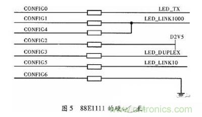 88E1111與C6678的MDIO模塊相連接,MDIO最多可識別32個物理芯片,在使用物理芯片之前需要對其進(jìn)行配置,配置內(nèi)容主要包括芯片的地址、模式等。配置CONFTG[6:0]管腳定義可查詢文獻(xiàn),本文配置的硬件電路如圖5所示,圖5中可以不使用電阻,本文為了測試方便,加一個0 Ω的電阻。
