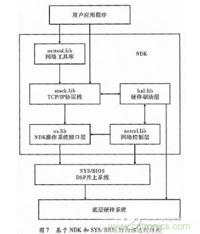 TI針對網(wǎng)絡(luò)開發(fā)發(fā)布了網(wǎng)絡(luò)開發(fā)套件(Network Development Kit,NDK),能將多個模塊的配置操作交給NDK網(wǎng)絡(luò)框架實(shí)現(xiàn),同時數(shù)據(jù)分包和解析也無需程序員過多考慮,加速了網(wǎng)絡(luò)開發(fā)進(jìn)程。NDK構(gòu)建在實(shí)時操作系統(tǒng)SYS/BIOS之上,NDK通過OS抽象層與BIOS進(jìn)行交互,同時BIOS的cfg配置文件能對NDK各模塊進(jìn)行可視化查看。