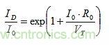 實(shí)際的電流比因指數(shù)函數(shù)而要求R0兩端的電壓不要大于VT。對于I0 = 2mA,R0 = 22Ω,VT = 26 mV,R0兩端的電壓為44mV或1.69xVT,ID = 14.77xI0 = 29.5mA,大于多數(shù)設(shè)計所需的值。為了使R0不在發(fā)射結(jié)電路中占主導(dǎo)地位,需要R0為這樣的小值,以便能表示VBE的TC。然而在許多設(shè)計中,R0相對較大,且其壓降遠(yuǎn)遠(yuǎn)超過VT。因此,re的TC%(VT)沒有得到正確補(bǔ)償,增益中存在TC漂移。