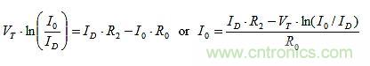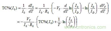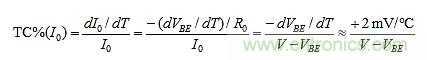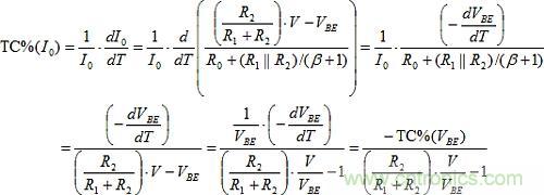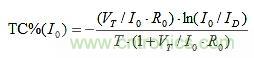 TC%(I0) = TC%(IE)的設(shè)定可以建構(gòu)如下。R0上的唯一變化來自VBE。因此,由T引起的I0的分?jǐn)?shù)變化是: