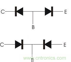2.發(fā)射結(jié)和集電結(jié)都是屬于pn結(jié),具備pn結(jié)的特性,因此其結(jié)構(gòu)相當(dāng)于一個(gè)極(陰極和陰極或者陽極和陽極)并聯(lián)在一起的兩個(gè)二極管,這個(gè)公共的電極就是基極,而另外兩個(gè)極就是集電極和發(fā)射極;見圖二,上面的對(duì)應(yīng)的是npn型三極管,下面的對(duì)應(yīng)的是pnp型三極管;