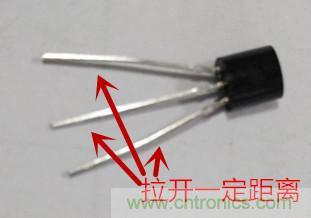 1.首先將三極管的三個(gè)管腳前后或者左右拉開一定距離,以便于測(cè)量;這樣可以避免表筆短路,如下圖三所示: