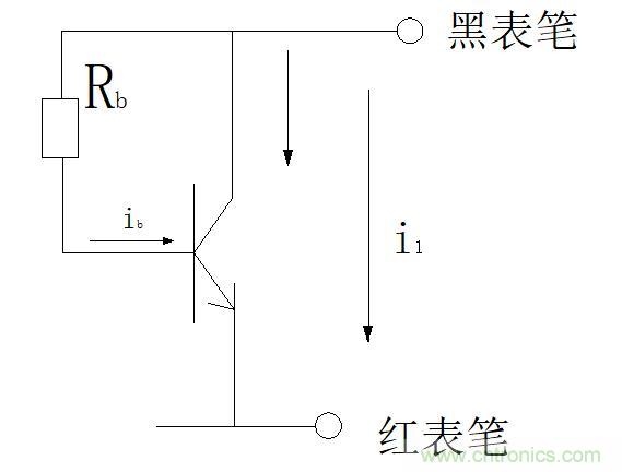 第二步測(cè)量原理圖如下:圖八所示Rb相當(dāng)于手指,它就是一個(gè)偏置電阻,三極管接法正確時(shí),基極施加了偏流,這時(shí)的集電極電流I1較大,相當(dāng)于萬用表阻值較小,它所對(duì)應(yīng)的正好是上圖六;