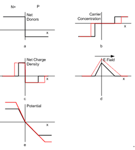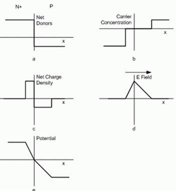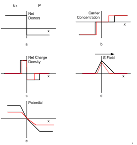 二極管的特性可以通過(guò)如圖1所示的突變型PN結(jié)來(lái)做深入理解??紤]到兩片硅材料,一片是重?fù)搅耸┲麟s質(zhì)的n+硅,一片是輕摻了受主雜質(zhì)的p硅。如圖1a所示那樣我們?cè)趚=0處將它們結(jié)合。n+區(qū)域電子密度等于施主雜質(zhì)的數(shù)目,而P區(qū)域認(rèn)為空穴密度等于受主雜質(zhì)濃度,但這種靜態(tài)情況將不會(huì)持續(xù)。在PN結(jié)邊界處電子將和空穴重新結(jié)合,結(jié)果是導(dǎo)致在PN結(jié)連接處的區(qū)域電子和空隙全被耗空。這就是圖1b所示的耗盡層,或者說(shuō)是零載流子濃度區(qū)域。在這個(gè)連接處區(qū)域隨著載流子濃度的耗盡就成為靜電荷區(qū)域,如圖1c。在橫坐標(biāo)零點(diǎn)左邊,由于電子和右邊的空穴中和從而只剩下帶正電的靜電荷;在零點(diǎn)右邊,由于空穴和左邊的電子中和從而只剩下帶負(fù)電的靜電荷。在PN結(jié)連接處的兩邊耗盡區(qū)的寬度依賴于兩邊施主雜質(zhì)和受主雜質(zhì)各自的摻雜濃度。有個(gè)物理現(xiàn)象是PN結(jié)耗盡區(qū)總的正電荷數(shù)和負(fù)電荷數(shù)一樣,所以PN總體還是呈現(xiàn)不帶電狀態(tài)。 PN結(jié)連接處摻雜濃度高的一邊的耗盡層寬度比摻雜濃度低的一邊要窄得多。 耗盡區(qū)一定的靜電荷密度的存在產(chǎn)生了一個(gè)電場(chǎng),其場(chǎng)強(qiáng)最大的地方是PN結(jié)連接處,如圖1d所示。PN結(jié)的電場(chǎng)存在產(chǎn)生了內(nèi)建電壓差,如圖1e所示。電場(chǎng)和電壓的存在會(huì)迫使電子向n區(qū)域移動(dòng),而空穴向p區(qū)移動(dòng)。