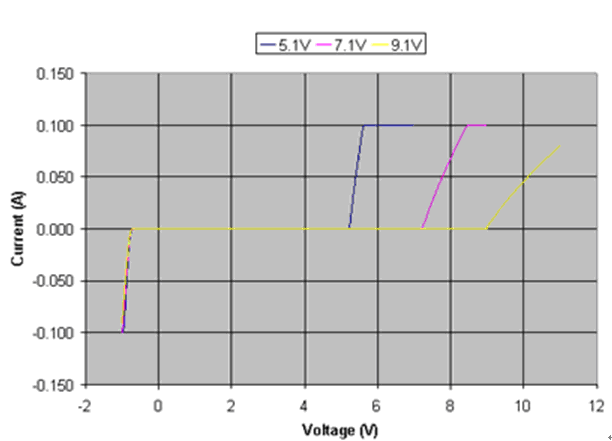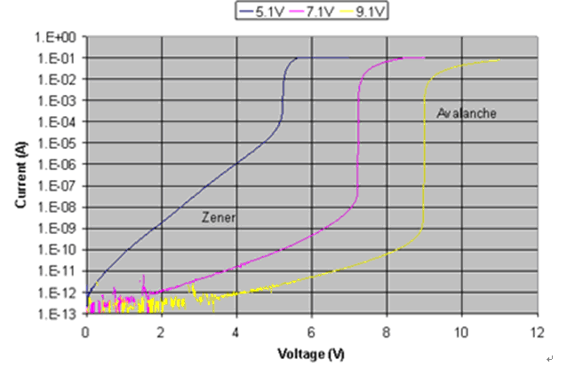 圖2:具有不同的反向擊穿電壓的穩(wěn)壓二極管的I-V曲線圖。電壓值是n區(qū)相對(duì)于p區(qū)的電壓