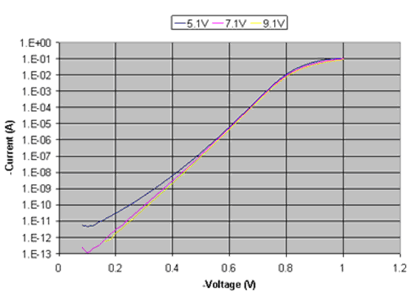 在高摻雜濃度下第二次擊穿發(fā)生。在高摻雜濃度下,電場(chǎng)變得太強(qiáng)以致電子從本質(zhì)上遠(yuǎn)離原子成為完全自由載流子。這個(gè)過(guò)程就是大家所知的齊納擊穿(在半導(dǎo)體中的一種非破壞性擊穿),這常常被描述為電子從禁帶到導(dǎo)帶的量子隧穿。齊納擊穿的電流相對(duì)電壓增長(zhǎng)相對(duì)5.1V二極管的雪崩擊穿有一個(gè)更大的斜率,如圖6所表示。