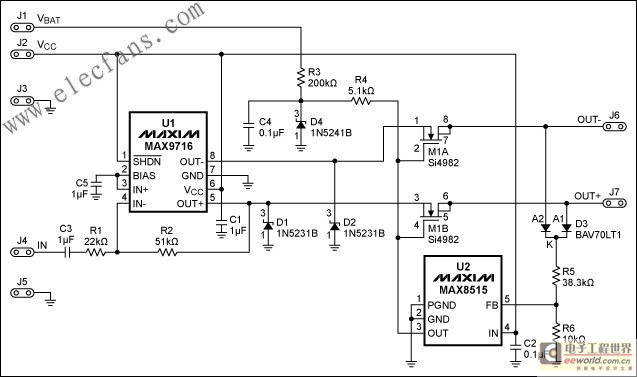 一個(gè)雙N溝道MOSFET斷開(kāi)在回答有關(guān)任何輸出高電壓狀態(tài)下從線束放大器輸出。 MOSFET管(M1A及數(shù)M1B)一般上,用自己的驅(qū)動(dòng)11V的齊納二極管的(4點(diǎn))及其約11V的偏置元件。這種雙二極管D3提供了一個(gè)在每個(gè)輸出直流電壓二極管或連接,從而產(chǎn)生電壓,控制分流穩(wěn)壓器U2樂(lè)隊(duì)(MAX8515)輸出。所示的電路U1的保護(hù),一個(gè)1.4W功率AB類放大器(MAX9716)以上(聲音警告和汽車的司機(jī)的跡象)中提到的應(yīng)用場(chǎng)合。