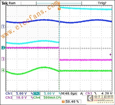 圖2的波形代表一個(gè)工作電路。放大器的輸出之一(上跟蹤,深藍(lán)色)是一個(gè)1kHz正弦波直流偏壓為2.5V。第二次跟蹤(青色)是線束上看到的信號(hào)。這也從一開(kāi)始就是在2.5V直流偏置一個(gè)1kHz正弦波,但200μs是一個(gè)18V電源短路。第三次跟蹤(洋紅色)是分流穩(wěn)壓器輸出,最初在11V的偏見(jiàn),但拉回應(yīng)過(guò)壓條件地面。第四次跟蹤(綠色)線束的電流。最初是一個(gè)正弦波,電流下降到零這個(gè)回應(yīng)過(guò)壓條件。