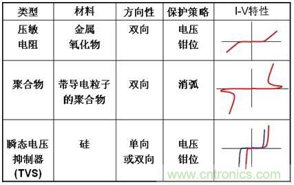 安森美半導(dǎo)體來自美國的ESD保護(hù)專家Robert Ashton博士說,一般而言,ESD保護(hù)元件的分類可以通過其保護(hù)策略與方向性來進(jìn)行,主要包括壓敏電阻、聚合物和瞬態(tài)電壓抑 制器(TVS)等,如表1所示。在這幾種保護(hù)元件中,壓敏電阻在低電壓時(shí),呈現(xiàn)出高電阻,其中的每個(gè)小型二極管兩端的電壓都相當(dāng)?shù)?,同時(shí)電流也相當(dāng)?。欢谳^高電壓時(shí),其中的獨(dú)立二極管開始導(dǎo)通,同時(shí)壓敏電阻的電阻會(huì)下降。從表1中我們也可以看出壓敏電阻為雙向保護(hù)元件。而對(duì)于帶導(dǎo)電粒子的聚合物而言,在正常電壓下,這些材料擁有相當(dāng)高的電阻,但當(dāng)發(fā)生ESD沖擊時(shí),導(dǎo)電粒子間的小間隙會(huì)成為突波音隙陣列,從而帶來低電阻路徑。