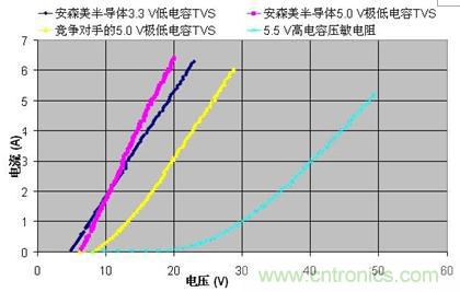 圖3的屏幕截圖就是這樣一個(gè)范例。從圖中可以看出,安森美半導(dǎo)體的TVS元件可以迅速將ESD應(yīng)力降低,即從8 kV靜電電壓鉗位到5至6 V的水平;但壓敏電阻的曲線則下降得很慢,而且無法降到很低的水平。該曲線表明,TVS器件的恢復(fù)時(shí)間非常短,經(jīng)過TVS器件泄漏到后面電路的能量也非常少,特別適合于便攜式設(shè)備的應(yīng)用。