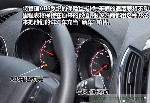 當您新購買車的時候發(fā)現(xiàn)車輛的里程表和車速表不工作時要注意了,因為很可能是奸商把您車輛管理ABS泵的保險絲給拆下來了,這樣車輛還能正常開但里程數(shù)不增加,而這也是很多奸商翻新試駕車后當新車賣的常用手段。