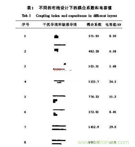 (1)印制板布局時,要將模擬電路區(qū)和數(shù)字電路區(qū)合理地分開,電源和地線單獨(dú)引出,電源供給處匯集到一點(diǎn);PCB布線時,高頻數(shù)字信號線要用短線,主要信號線最好集中在PCB板中心,同時電源線盡可能遠(yuǎn)離高頻數(shù)字信號線或用地線隔開。其次,可以根據(jù)耦合系數(shù)來布線,盡量減少干擾耦合。(見表1)
