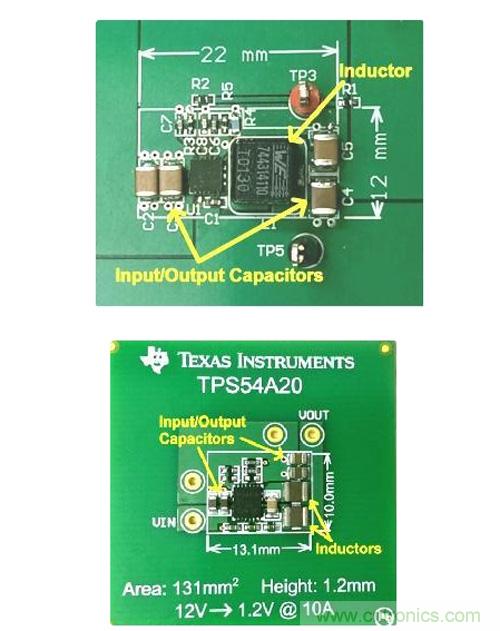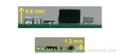 穩(wěn)壓器尺寸的減小為我們提供了更多的機(jī)會(huì)。對(duì)比圖2中所示的高度剖面圖我們可以看到,常規(guī)降壓變換器的高度為4.8毫米,然而對(duì)于背面部件而言,這一高度遠(yuǎn)超很多系統(tǒng)的高度限制。串聯(lián)電容降壓轉(zhuǎn)換器(1.2毫米高)的低斷面可以讓您將穩(wěn)壓器置于電路板背面,這樣便可以釋放寶貴的頂側(cè)基板面。之前將整個(gè)10A轉(zhuǎn)換器置于其背面在之前不太現(xiàn)實(shí),因?yàn)闊o源部件體積過大, 但如今有了TPS54A20,一切便成了可能。