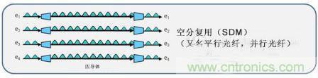 空分復用,通常被稱為并行光纖,是一種通過在復合鏈路中增加一條或多條光纖來增加一個或多個通道的方式。在這種情況下,一個通道實際上就是另一股光纖。這是上述時分復用通道的一個替代方案,在時分復用中,信號以按時間合并在同一條光纖上。行業(yè)中有很多應用這種技術的例子。例如,40G SR4通過使用四通道或光纖,在多模光纖上提供40Gbps的速率。也就是在每個方向上有四個通道。這也正是“SR4”中4的含義,4個通道,每個10Gbps。