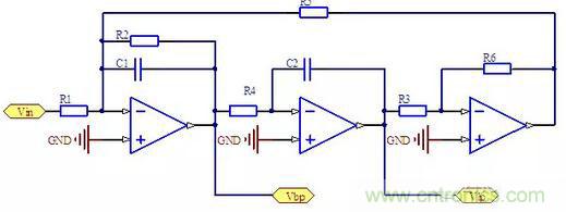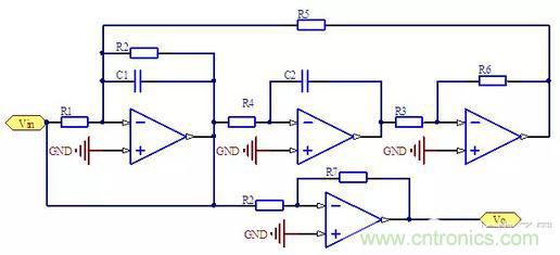 原始信號(hào)減去帶通信號(hào)就稱(chēng)為帶阻信號(hào)了,因此再增加一個(gè)運(yùn)放就可以實(shí)現(xiàn)帶阻型濾波器。