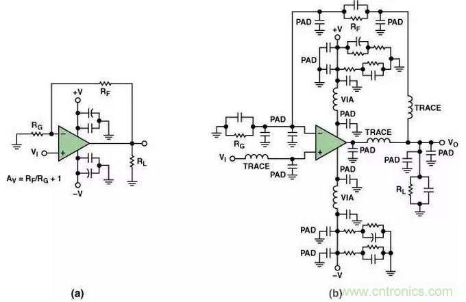 所謂寄生效應(yīng)就是那些溜進(jìn)你的PCB并在電路中大施破壞、頭痛令人、原因不明的小故障(按照字面意思)。它們就是滲入高速電路中隱藏的寄生電容和寄生電感。其中包括由封裝引腳和印制線過長形成的寄生電感;焊盤到地、焊盤到電源平面和焊盤到印制線之間形成的寄生電容;通孔之間的相互影響,以及許多其它可能的寄生效應(yīng)。圖3(a)示出了一個典型的同相運(yùn)算放大器原理圖。但是,如果考慮寄生效應(yīng)的話,同樣的電路可能會變成圖3(b)那樣。