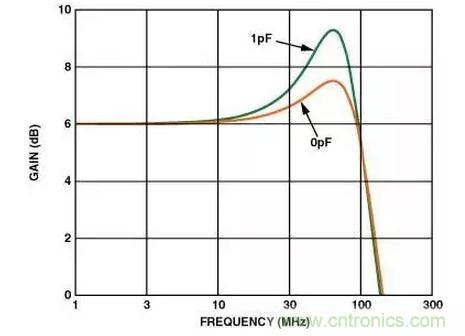 在高速電路中,很小的值就會影響電路的性能。有時候幾十個皮法(pF)的電容就足夠了。相關(guān)實例:如果在反相輸入端僅有1 pF的附加寄生電容,它在頻率域可以引起差不多2 dB的尖脈沖(見圖4)。如果寄生電容足夠大的話,它會引起電路的不穩(wěn)定和振蕩。