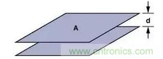 當(dāng)尋找有問題的寄生源時,可能用得著幾個計算上述那些寄生電容尺寸的基本公式。公式(1)是計算平行極板電容器(見圖5)的公式。