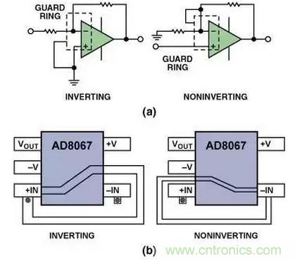 圖15(a)示出了用于運(yùn)算放大器反相配置和同相配置中的保護(hù)環(huán)的原理圖。圖15(b)示出用于SOT-23-5封裝中兩種保護(hù)環(huán)的典型布線方法。