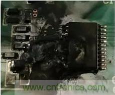 下圖就是由于反向電流通過元器件,導致電路板上的元器件燒毀。