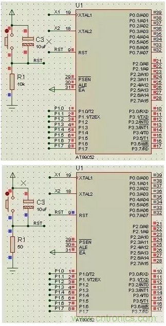 大家可以看到復(fù)位電路中電阻R1=10k時RST是高電平 ,而當(dāng)R1=50時RST為低電平,很明顯R1=10k時是錯誤的,單片機一直處在復(fù)位狀態(tài)時根本無法工作。出現(xiàn)這樣的原因是由于RST引腳內(nèi)含三極管,即便在截止?fàn)顟B(tài)時也會有少量截止電流,當(dāng)R取的非常大時,微弱的截止電流通過就產(chǎn)生了高電平。