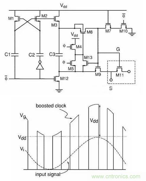 電路用在各種ADC之前的Sample電路,可以讓ADC實現rail to rail的input,sample電路的工作電壓超過Vdd,極大的減少了了setting time,而且?guī)缀鯖]有reliability的問題。電路里沒有任何一個器件是可以被減少或者改變位置的。此電路直接使得ADC的發(fā)展往前躍進了一大步,現在已經幾乎成為除ΔΣ之外各種ADC的標配,成為歷史上最經典的模擬電路之一。當然,電路原理一眼看去也不是很好理解。