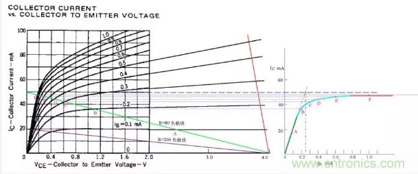 圖中假定電源電壓為4V,綠色的斜線是負(fù)載電阻為80歐姆的負(fù)載線,V/R=50MA,圖中標(biāo)出了Ib分別等于0.1、0.2、0.3、0.4、0.6、1.0mA的工作點(diǎn)A、B、C、D、E、F。據(jù)此在右側(cè)作出了Ic與Ib的關(guān)系曲線。根據(jù)這個(gè)曲線,就比較清楚地看出“飽和”的含義了。曲線的綠色段是線性放大區(qū),Ic隨Ib的增大幾乎成線性地快速上升,可以看出β值約為200。蘭色段開始變彎曲,斜率逐漸變小。紅色段就幾乎變成水平了,這就是“飽和”。實(shí)際上,飽和是一個(gè)漸變的過程,蘭色段也可以認(rèn)為是初始進(jìn)入飽和的區(qū)段。在實(shí)際工作中,常用Ib*β=V/R作為判斷臨界飽和的條件。在圖中就是假想綠色段繼續(xù)向上延伸,與Ic=50MA的水平線相交,交點(diǎn)對(duì)應(yīng)的Ib值就是臨界飽和的Ib值。圖中可見該值約為0.25mA。