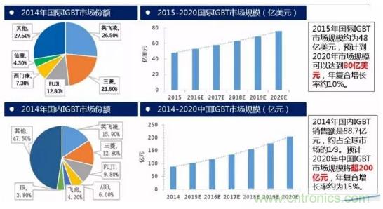 2015年國際IGBT市場規(guī)模約為48億美元,預(yù)計到2020年市場規(guī)??梢赃_到80億美元,年復(fù)合增長率約10%。2014年國內(nèi)IGBT銷售額是88.7億元,約占全球市場的1∕3。預(yù)計2020年中國IGBT市場規(guī)模將超200億元,年復(fù)合增長率約為15%。