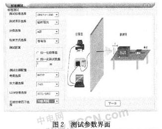 界面模塊貫穿于整個軟件系統(tǒng)是軟件的心靈之窗,它的優(yōu)劣直接影響了用戶使用整個系統(tǒng)的感受。充分考慮了用戶的需求和當(dāng)今軟件的發(fā)展趨勢之后,本文設(shè)計出人性化和易于理解的界面輸入程序。首先,標(biāo)準(zhǔn)選擇界面用戶只需選擇所需的標(biāo)準(zhǔn)系統(tǒng)會自動從數(shù)據(jù)庫篩選被選標(biāo)準(zhǔn)所規(guī)定的測試項目、分類、檢波方式、測試所需儀器等供用戶選擇并自動產(chǎn)生測試儀器連接配置圖。其次,軟件提供了多種界面風(fēng)格及色彩,加入了當(dāng)今軟件的流行元素,避免了用戶審美疲勞,如圖2、3所示。