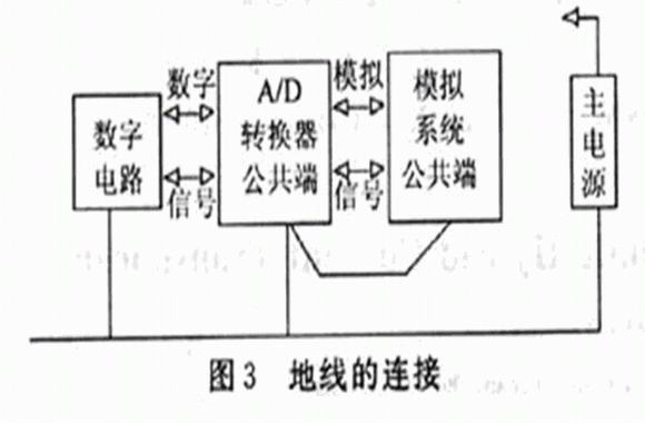 數(shù)字地線通常有很大的噪聲,而且有大的電流尖峰,所有的模擬公共地線應(yīng)該和數(shù)字公共地線分開走線,然后只在一點匯集在一處,如圖3所示,這種接法使模擬和數(shù)字地線間的公共阻抗最小。