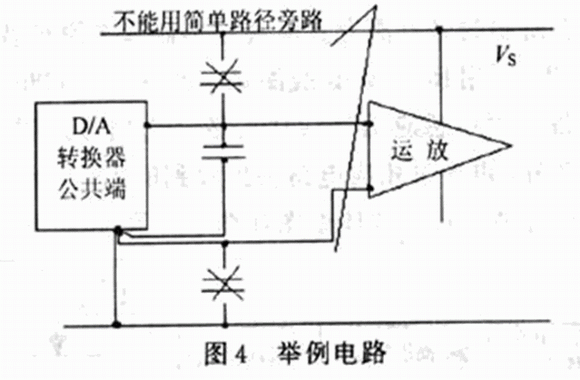 圖4說明這樣一種方法,他應(yīng)用于模擬量輸出運算放大器對于數(shù)/模轉(zhuǎn)換器數(shù)字驅(qū)動噪聲的去耦,如果旁路電容隨意地直接接到電源的兩根母線之間,旁路電容起不到應(yīng)有的作用,甚至可能有害,他從"不干凈"的到"清潔"的Vs,為噪聲提供低阻抗的交流通路。