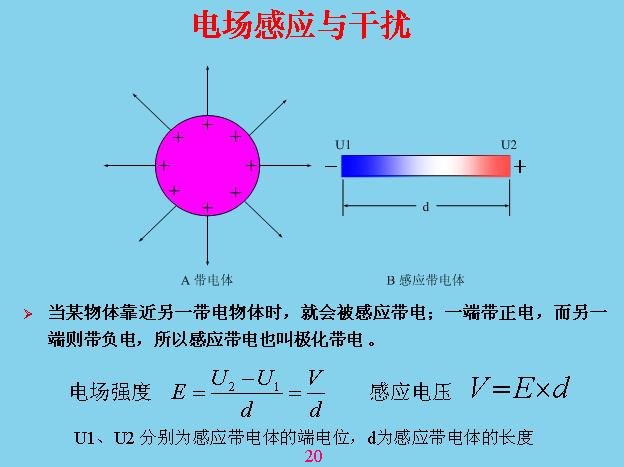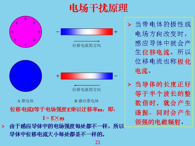 電磁干擾的原理是帶電體電磨和位能不斷的改變,會對感應(yīng)體產(chǎn)生位移電流,當(dāng)這邊是正的時候,電流的方向往這邊流,當(dāng)是負的時候電流往另外一邊流。位移電流和一般電工學(xué)里面的位移電流不一樣,位移電流不需要回路,在任何一個導(dǎo)體里面都會產(chǎn)生位移電流,并且位移電流的大小在這個導(dǎo)體里面的每個地方都不一樣,不管這個怎么變化,中間位移電流等于零,只在兩端位移電流是最的大,中間那個地方等于零。如果你不好理解,你把這個當(dāng)成一根天線就理解了,天線發(fā)射電磁波的時候也是沒有回路的,就是靠不斷的對它進行充放電,這個原理是一樣的。還有一種情況,當(dāng)兩個變換的速度和來回移動的方向、距離正好是半個波長的時候它會產(chǎn)生諧振,這個在天線理論里面可以學(xué)到。因為位移電流是有速度的,不能說速度等于無窮大,我這邊變你也變,如果移動有速度就會產(chǎn)生疊加和抵消的作用,就會產(chǎn)生諧振。