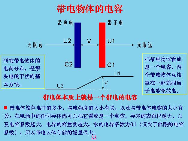 我們給大家介紹一個很重要的概念,就是電容。這個電容和我們現(xiàn)在電路里面用的電容是兩個概念,大家不要混淆。任何帶電體我們都可以把它看成一個電容,電容的大小跟它帶的電壓和電荷的多少有關(guān),如果帶的電荷越多,電壓越高它的電流就越大。電容的概念其實與電荷的概念也是互相對應(yīng)的,我們把這個電容器看成是兩個電容進行串聯(lián),也就是說帶電體帶正電,帶正電是對于無限遠的地方來說的,為什么呢?因為這個帶電以后電場分布是發(fā)散性的,中間這一點是最強,離的越遠的時候電感強度就越來越低,當(dāng)無限遠的時候就等于零,你不能拿它來參考地球,參考地球的話相當(dāng)于范圍太小,本身地球也可以看成電容,所以分析電容的時候最好用無限遠的地方作為參考點。也就是說我們計算電容的時候以無限遠的地方考慮,計算電容也是以無限遠的地方考慮。把這兩個電容靠在一起的時候就變成了電容器,你就可以利用這兩個電容的電位梯度和電容器來分析。任何一個帶電體都可以看成一個電容,一個孤立球?qū)w的電容等于表面積除以半徑,再乘以電容系數(shù)。地球的容量算出來就是7×10-4(F),把兩個孤立電容進行推導(dǎo),算出來就是這樣,電容器正好等于上面儲存的電容量除以電位差。明白電容的概念以后,也要分析電路的電磁感應(yīng)方面,要有量的概念。有了量的概念我們可以對電磁干擾進行分析,比如說這邊是一個干擾電壓,通過這條電路進行供電,旁邊也有一個電路,這個電路就會受到干擾,干擾怎么計算?它的導(dǎo)向電路是什么?我們可以把兩個導(dǎo)線看成一個電容器,就是有一個耦合電容。等效電路相當(dāng)于這邊,你要減少兩個回路互相干擾的程度就必須要減少上面的Cm電容,把兩條線隔得越遠越好,而且越短越好,只要面積越小電容器越小,離得越遠電容器也越小。