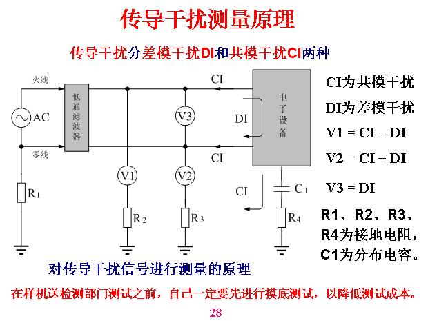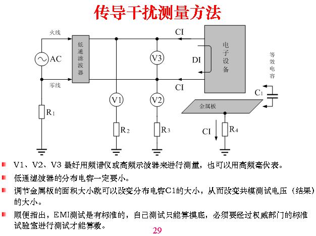 傳導(dǎo)干擾測量原理。這里面?zhèn)鲗?dǎo)干擾有兩個干擾,一個是共模,一個是差模,這樣一個回路是流進入又流出來的,這叫做差模。這兩個同時進去從另外一邊流出來叫共模,共模干擾很簡單,就是以大地為一端,另外一端是以上面的線路、設(shè)備,不管什么線為一端測到的電壓,這叫做共模干擾。因為測量的時候必須要與一根電路連接,先測三個電壓,這是測這個與大地之間的電壓,這是測兩條線之間的電壓,然后得出結(jié)算公式。V1=CI-DI,就是共模干擾減去差模干擾。V2=CI+DI,V3=DI,R1、R2、R3、R4為接地電阻,C1為分布電容,如果到檢測所去測之前自己一定要先進行摸底測試,用一塊墊板或金屬板放在下面接地,等于說分布是固定的,利用標(biāo)準一塊板與機器造成分布電容,一般是一個平方米等等,是由他們定的,你可以做試驗,測多大都沒有關(guān)系,但它是固定的,測電視機是什么樣,測手機是什么樣,這是不一樣的。傳導(dǎo)干擾測量方法。分布電容在這一塊金屬板,與它之間產(chǎn)生分布電容,當(dāng)然用這個板帶分布電容,測出來的結(jié)果數(shù)字越大,這只是用來做對比,以此為基礎(chǔ)。我們做摸底可以用大一點測,容易測得到,但你測得不算數(shù)。