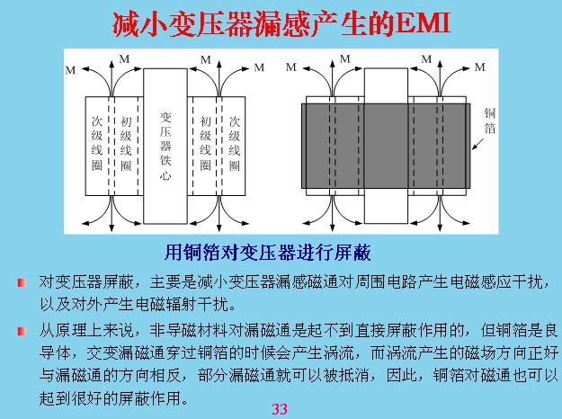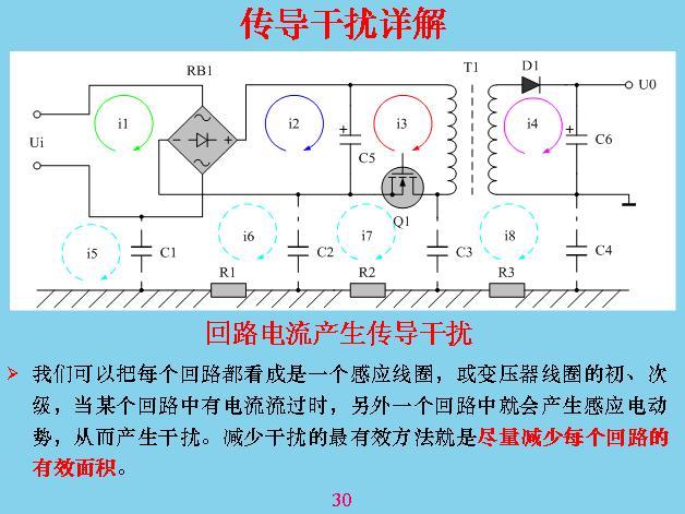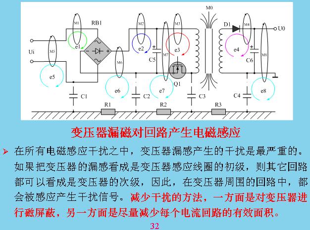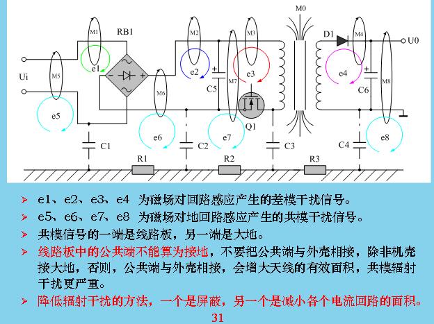 這個更加具體,有電力穿過的時候會產(chǎn)生電力線,電力線會產(chǎn)生共模干擾,這幾個都是共模干擾,那些都是差模干擾。這些干擾主要是如何產(chǎn)生的?本身線路里面只有電流流過,構(gòu)成一個線圈或?qū)Ь€都會產(chǎn)生干擾,最大的是變壓器漏感,這是其他回路的好幾十倍。所以變壓器漏感最好進行屏蔽?怎么屏蔽呢?在線圈的外邊用一層金屬,鋁片也好,銅片也好,一般用銅片包起來,包起來應(yīng)該讓它短路,就是用焊絲焊起來,漏感在上面也會產(chǎn)生渦流,一產(chǎn)生渦流就會產(chǎn)生抵消干擾的磁場,就相當(dāng)于把漏感抵消掉。